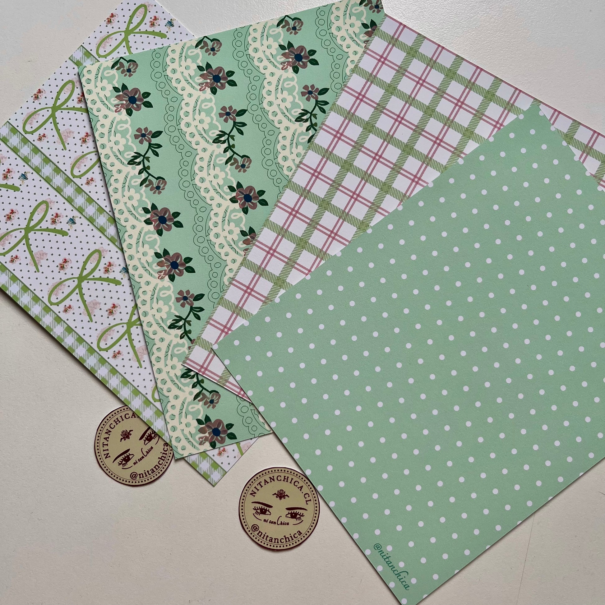 Una colección de Ni tan Chica de 4 láminas adhesivas tamaño 12 x 15 cm. Diseños en tonos verde menta, con detalles florales y geométricos. Perfectos para darle un toque nostálgico y romántico a tus proyectos de journal, junk journal, scrapbooking o decoración de diarios.