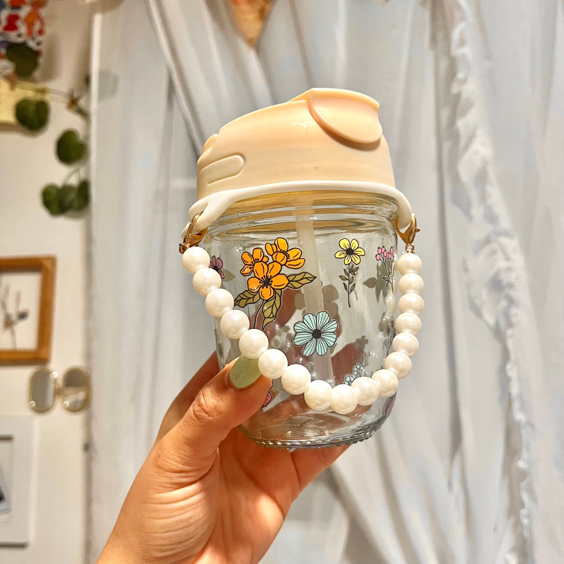 Cómodo y adorable vasito de vidrio con tapa doble, para tomar bebidas calientes y heladas, tiene un detalle de perlita que te permite llevarlo en tu bolso.