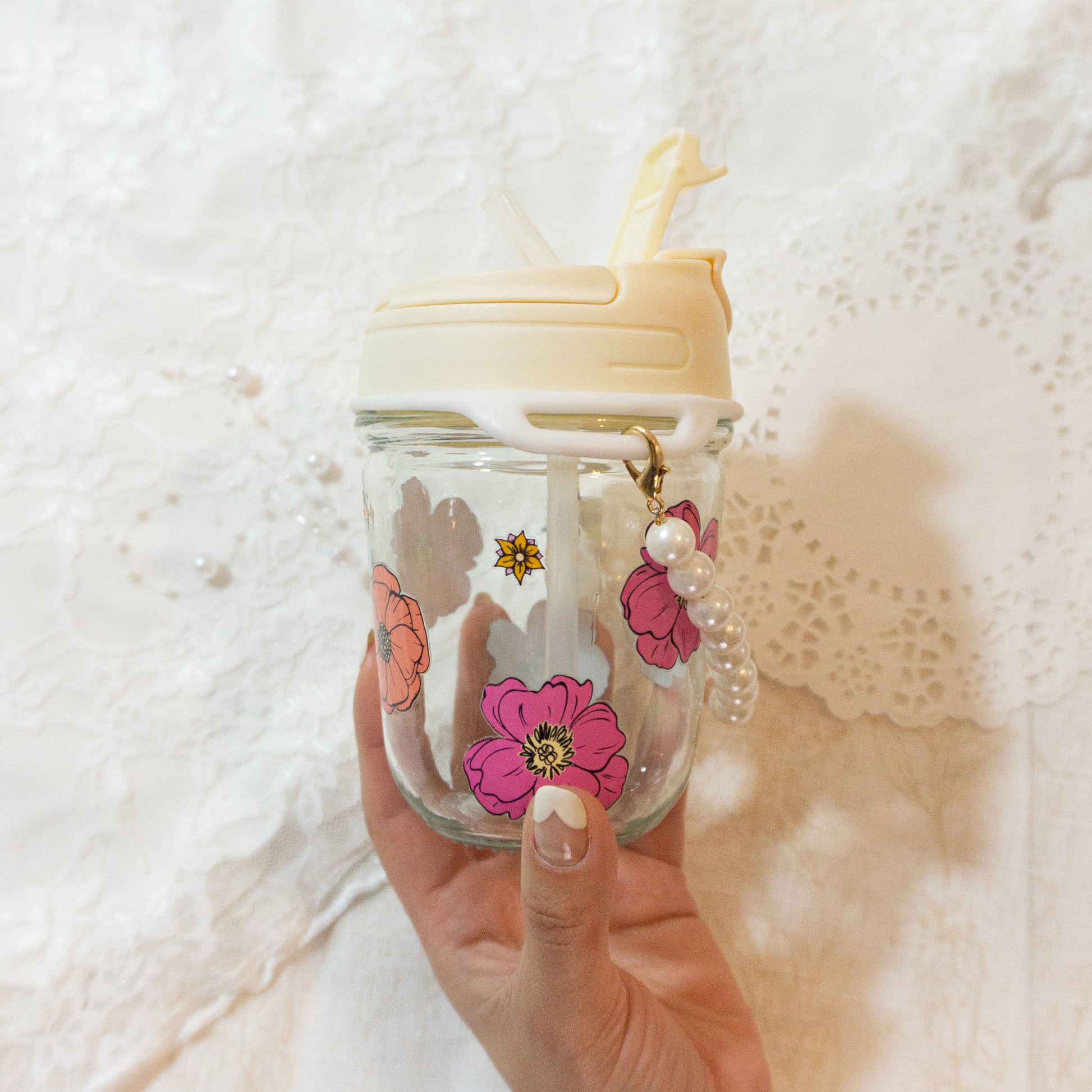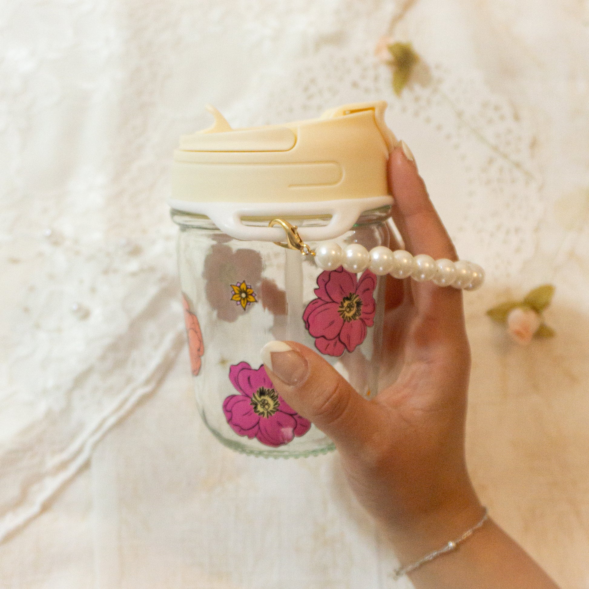 Cómodo y adorable vasito de vidrio con tapa doble, para tomar bebidas calientes y heladas, tiene un detalle de perlita que te permite llevarlo en tu bolso.