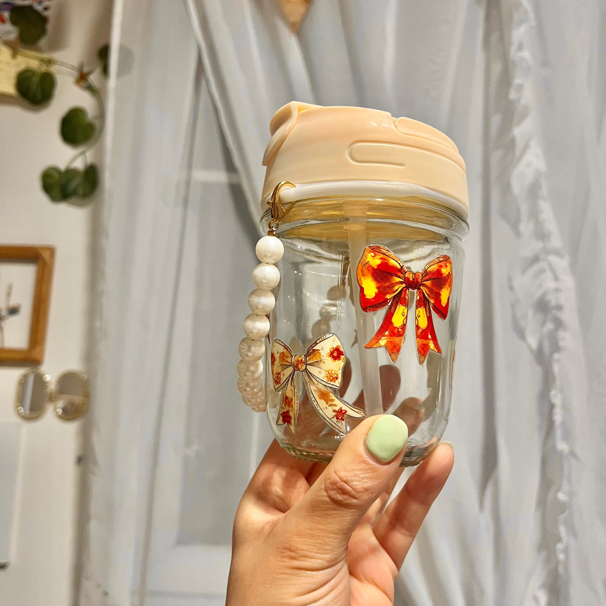 Cómodo y adorable vasito de vidrio con tapa doble, para tomar bebidas calientes y heladas, tiene un detalle de perlita que te permite llevarlo en tu bolso.